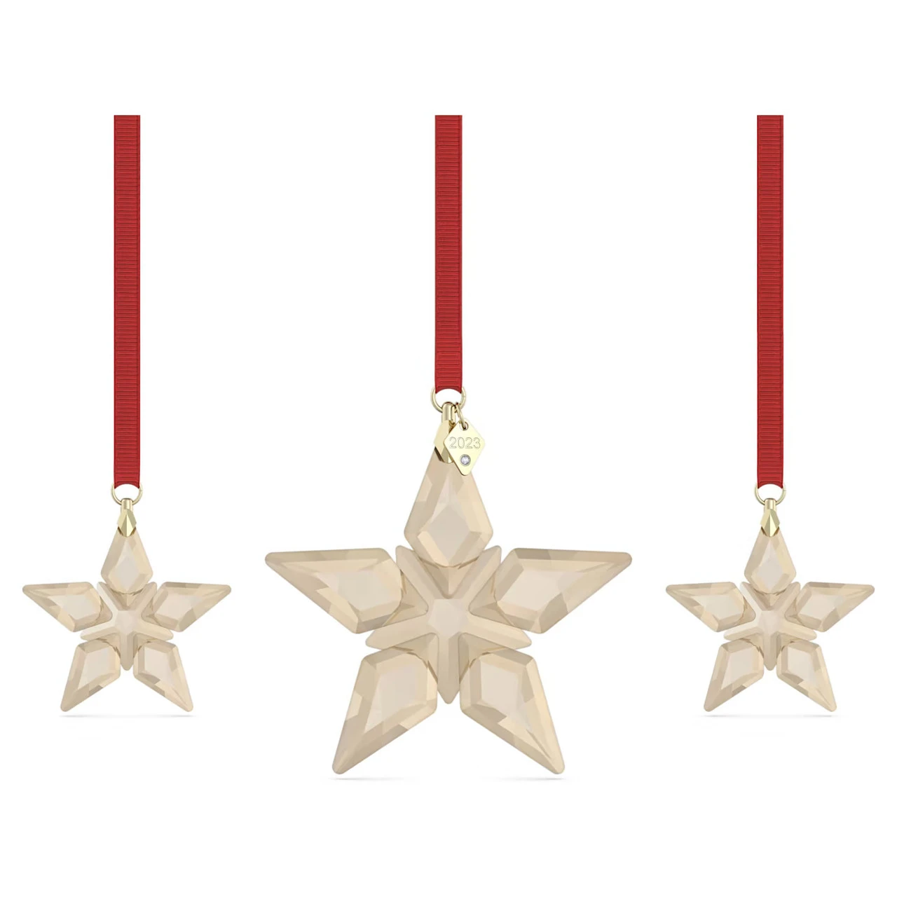 This shining trio of festive stars continues the Swarovski Annual Edition Ornament holiday tradition. The three magical stars for 2023, with a total of 291 precision-cut facets in golden crystals, are inspired by the harmony of nature and science, which is brought to life by Swarovski’s unmistakable savoir-faire and expert precision. The set features the Festive Annual Edition Ornament and two smaller versions of the same design. The main star is topped with an elegantly engraved tag reflecting the year and all three hang from a red grosgrain ribbon. A wonderful compilation of decorations to illuminate your tree or make a radiant centerpiece for your holiday celebrations. Decoration object. Not a toy. Not suitable for children under 15.