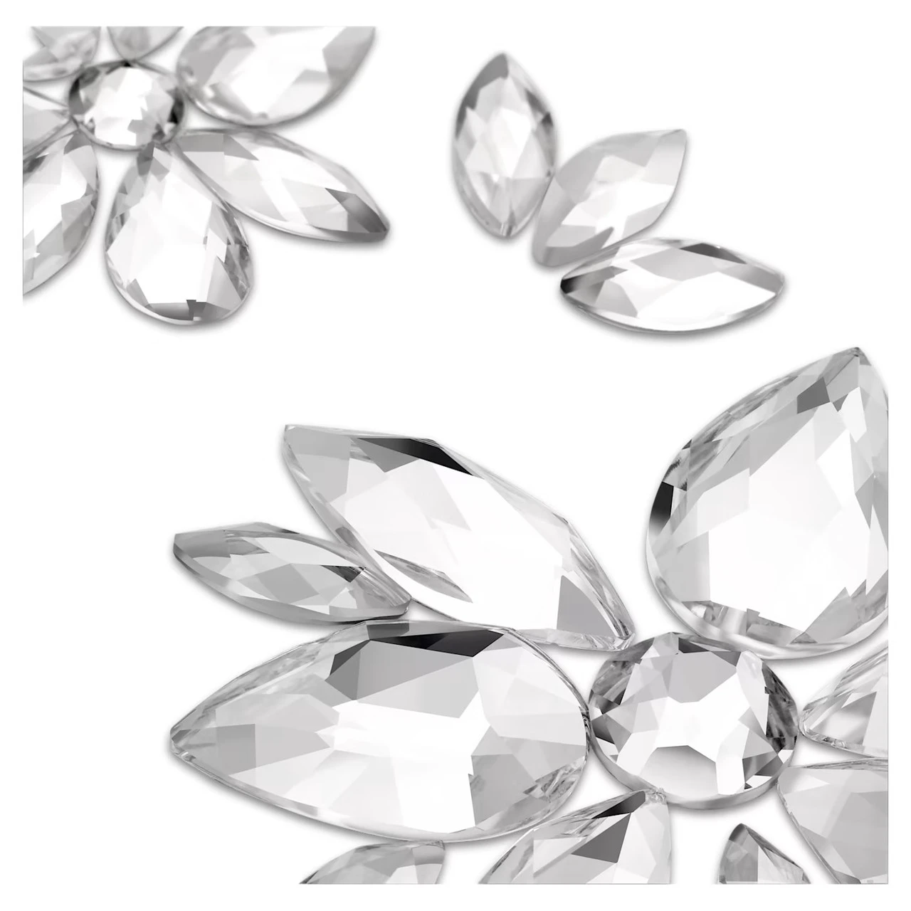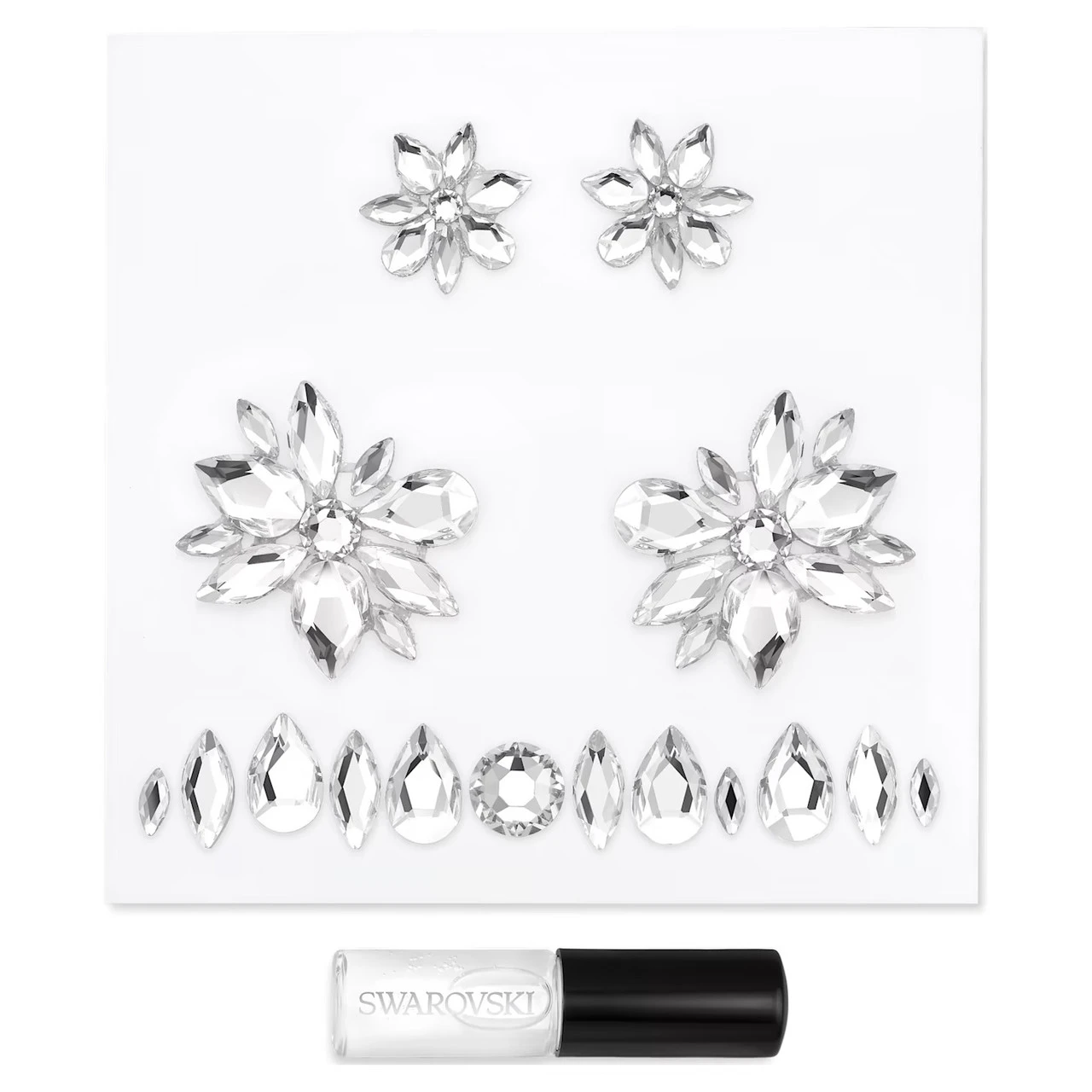 These re-wearable body jewels are the essence of joyful glamour, designed to be worn on your body to amplify your style for festivals and special celebrations. This set contains two small and two medium floral designs, plus a fifth floral motif that can be customized using 12 loose crystals. It also includes a gloss adhesive so they can be worn multiple times. Style them however you like and shine on. Not a toy. Not intended for use by children under the age of 15.