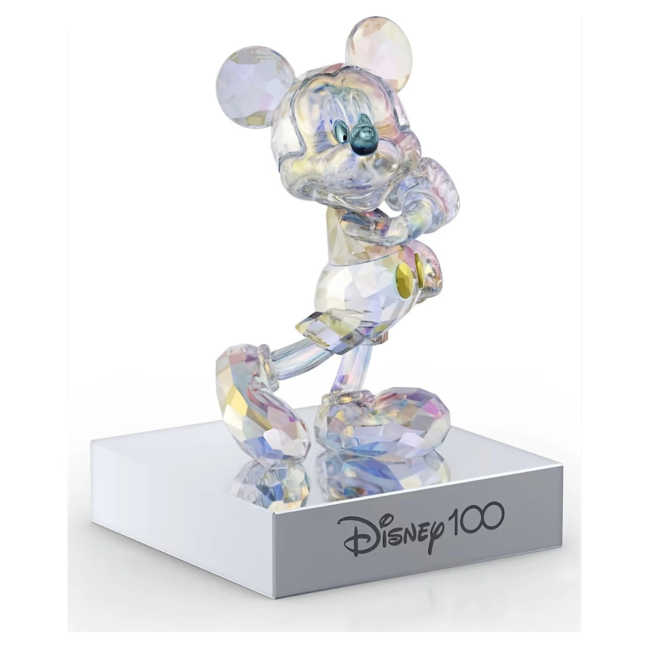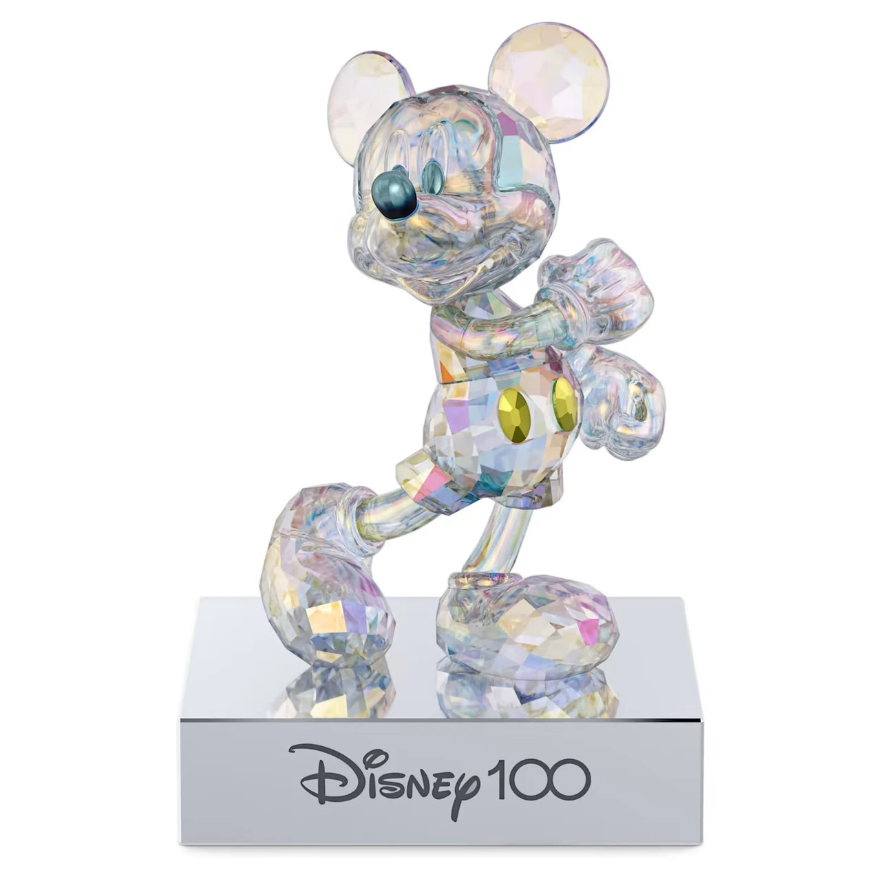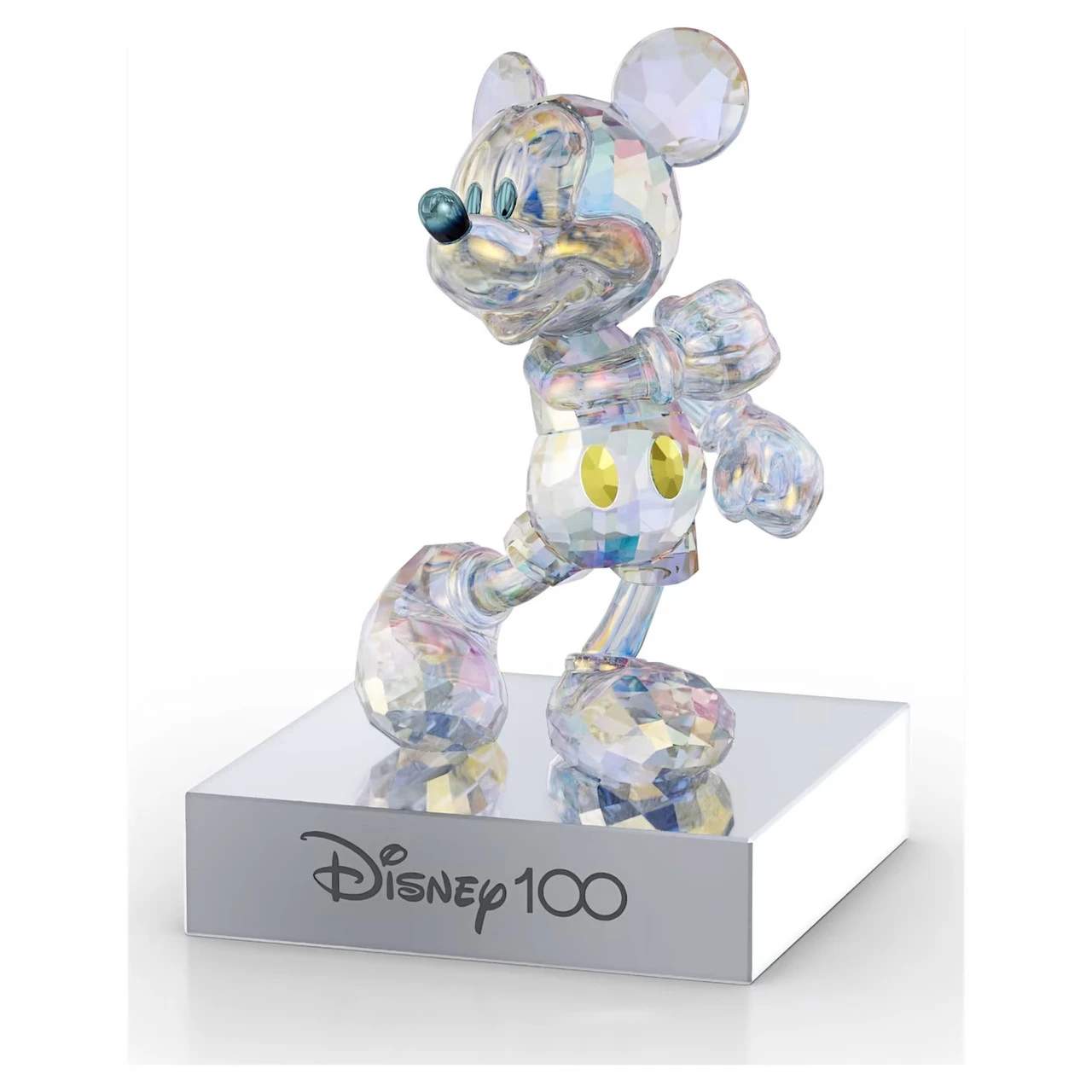 This ultra-radiant Mickey Mouse-inspired figurine celebrates Disney100 with a beautiful example of Swarovski’s savoir-faire. Showing Mickey in a typically dynamic pose cut with 530 facets, it has a reflective platinum look created with an all-over coating of our signature Aurora Borealis effect for increased shimmer and intensity. The metallic base has a chrome finish and black velvet bottom, with “Disney100” engraved on the front. The figurine can be removed from the base and placed anywhere in your home. A playful piece that commemorates one of the world’s most beloved animated characters. Decoration object. Not a toy. Not suitable for children under 15.