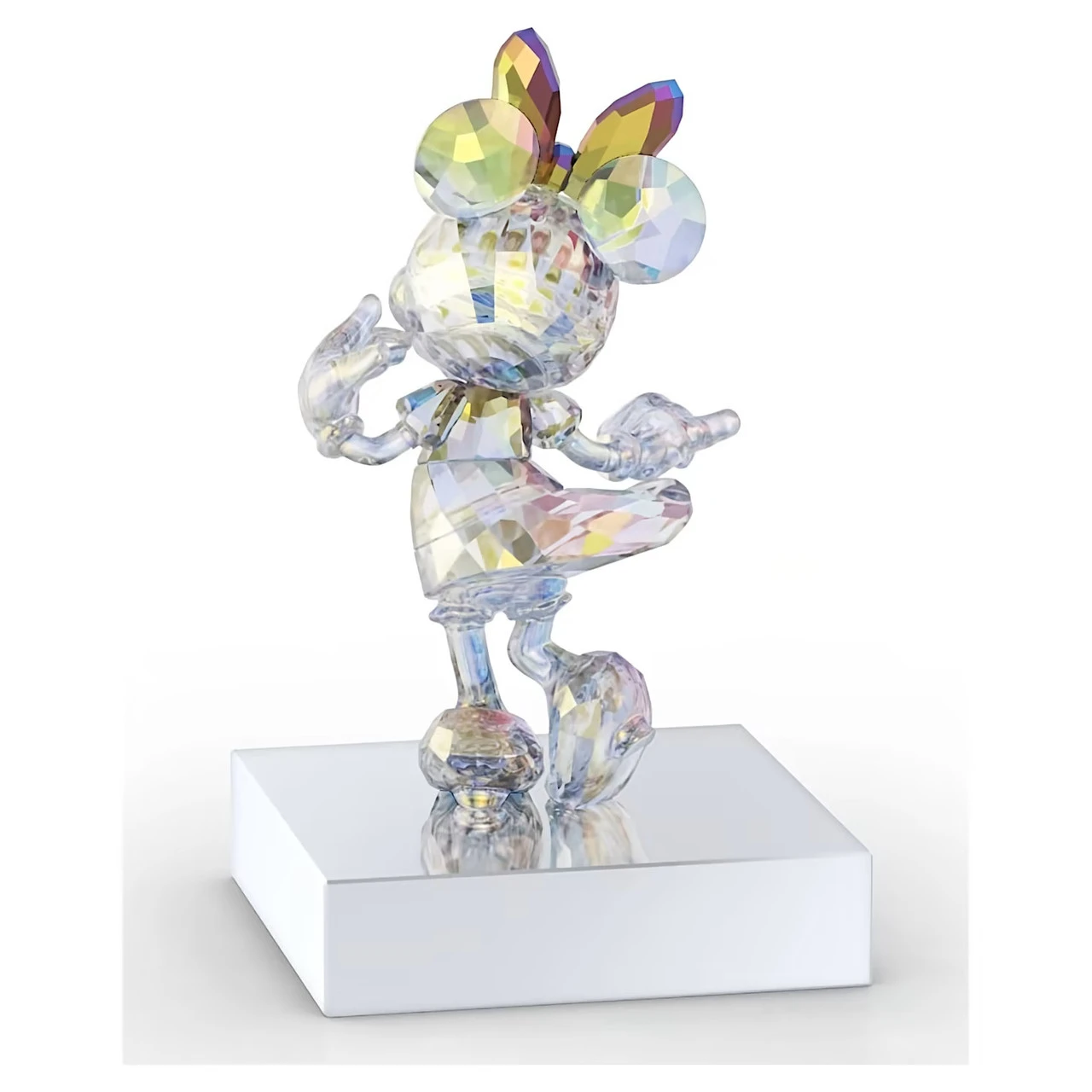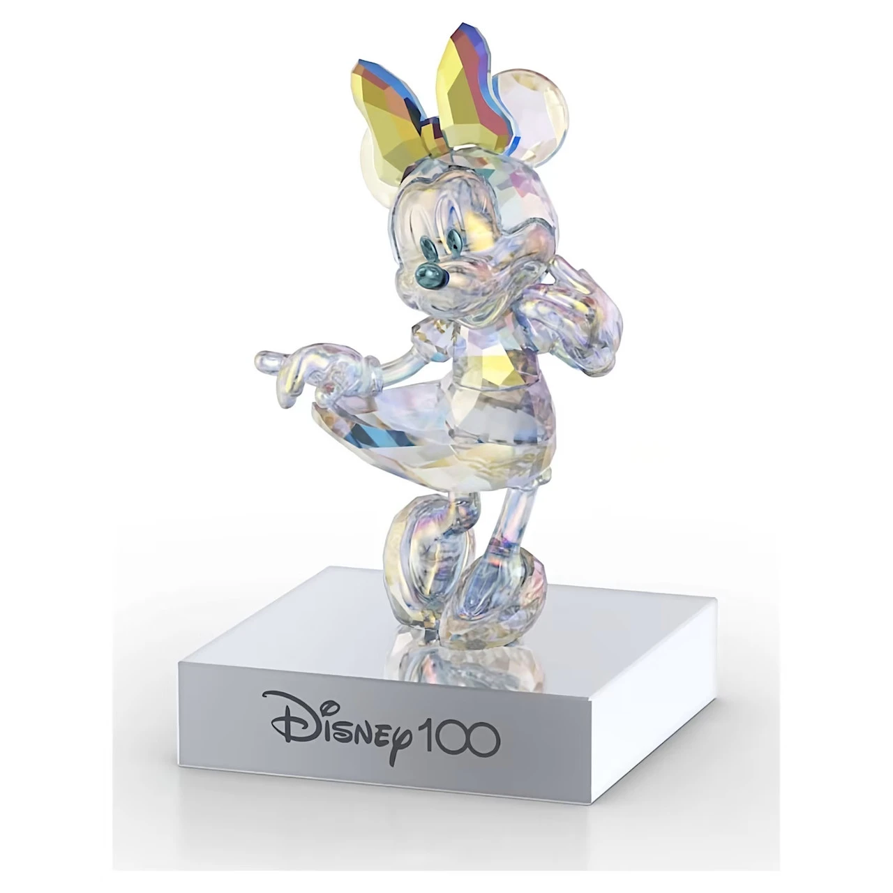 This joyful Minnie Mouse-inspired figurine celebrates Disney100 with a beautiful example of Swarovski’s savoir-faire. Showing Minnie in a playful curtsy pose cut with 638 facets, it has a reflective platinum look created with an all-over coating of our signature Aurora Borealis effect for increased shimmer and intensity. The metallic base has a chrome finish and black velvet bottom, with “Disney100” engraved on the front. The figurine can be removed from the base and placed anywhere in your home. A playful piece that commemorates one of the world’s most beloved animated characters. Decoration object. Not a toy. Not suitable for children under 15.