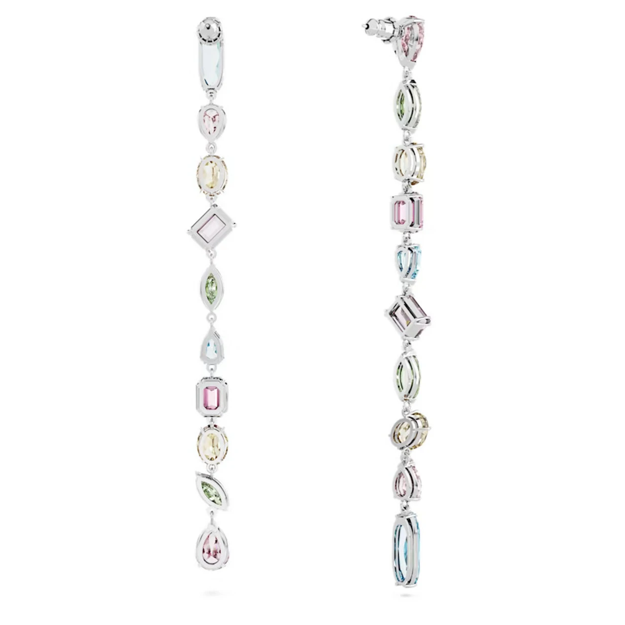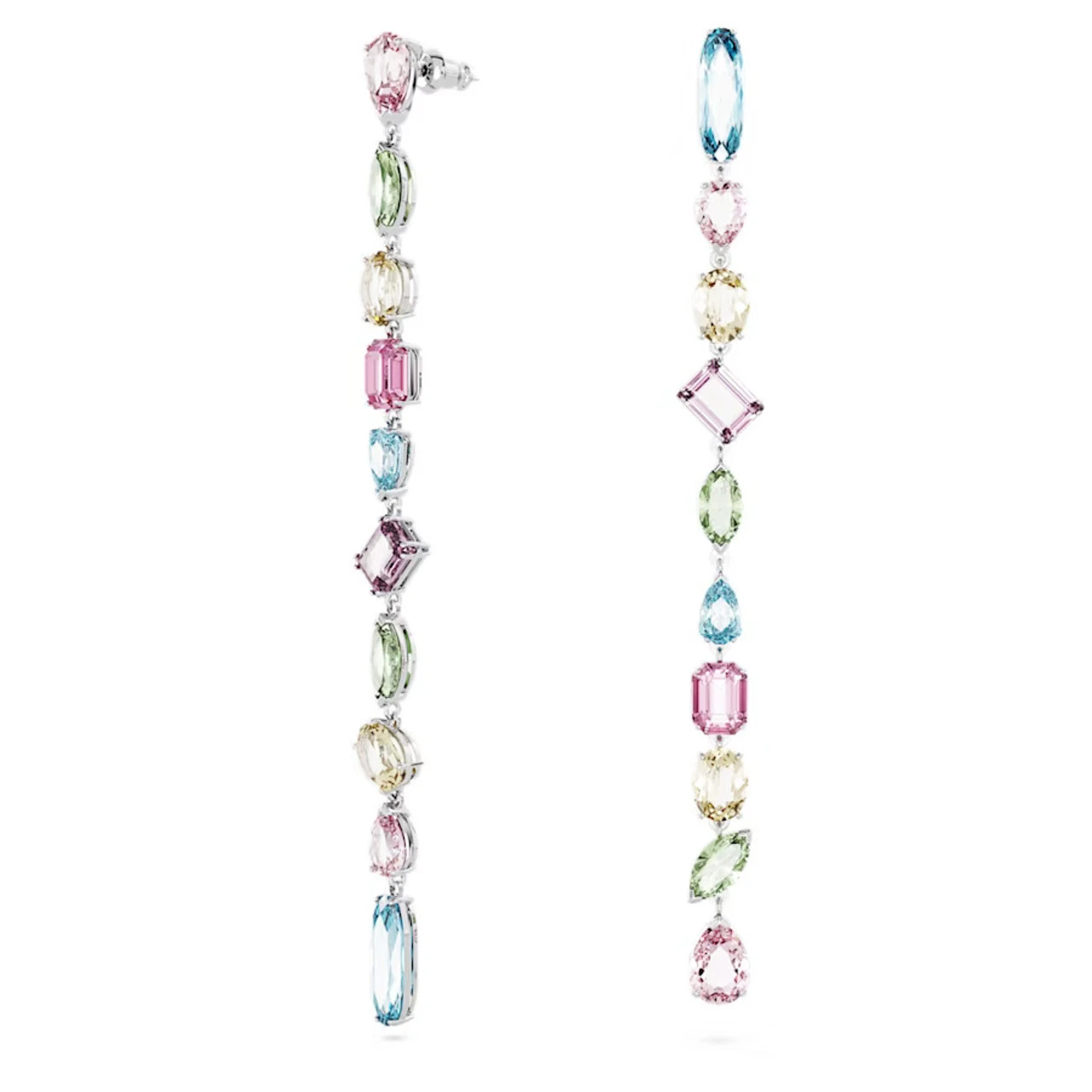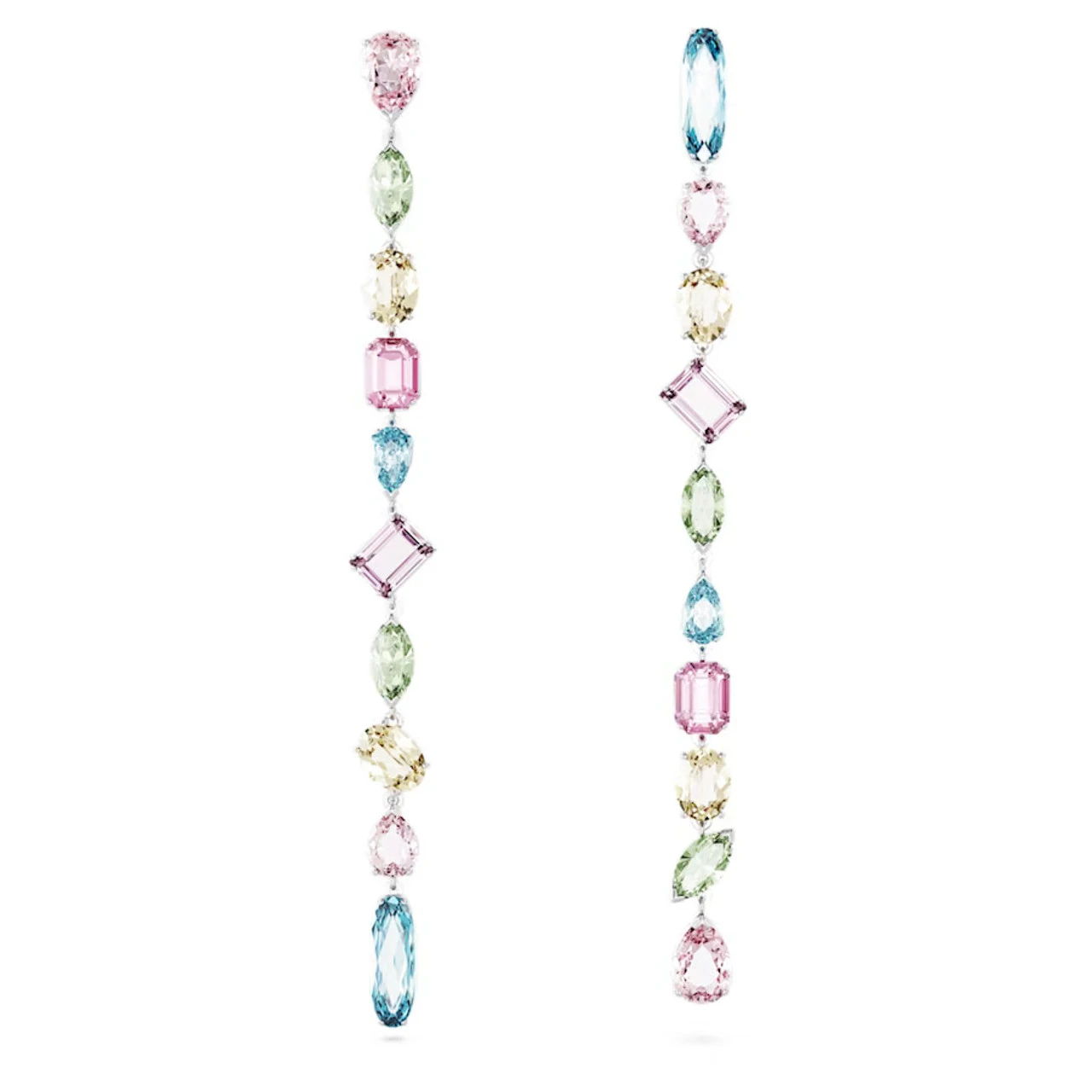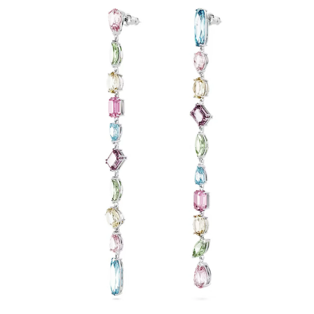 These playful Gema drop earrings are crafted with long strands of faceted crystals to catch the light. Each rhodium plated piece is adorned with a mix of stone cuts that glisten with a variety of vibrant hues. The effect is one of unexpected beauty, with mood-boosting colors guaranteed to bring joy to your day.