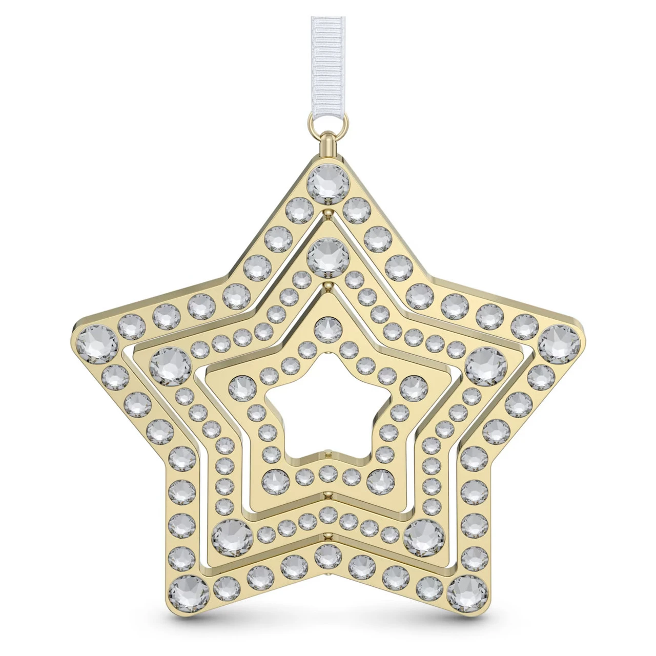 Add some light-catching magic to your holiday décor with this bright star ornament. Inspired by the Stella family, this champagne gold-tone design is adorned on both sides with a pavé of 200 crystals. The magic continues with a 360° spinning mechanism which enables the central two stars to rotate, animating the ornament into a gorgeous 3D shape. Suspended on white grosgrain ribbon, this is the perfect star to make your home shine bright. Decoration object. Not a toy. Not suitable for children under 15.