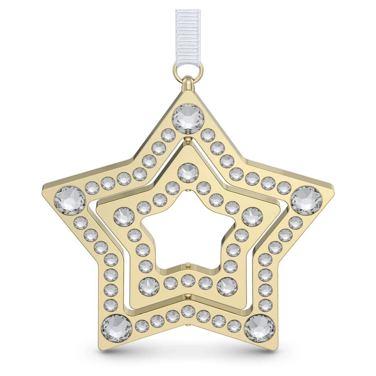 Add some light-catching magic to your holiday décor with this bright star ornament. Inspired by the Stella family, this champagne gold-tone design is adorned on both sides with a pavé of 120 crystals. The magic continues with a 360° spinning mechanism which enables the central star to rotate, animating the ornament into a gorgeous 3D shape. Suspended on white grosgrain ribbon, this is the perfect star to make your home shine bright. Decoration object. Not a toy. Not suitable for children under 15.