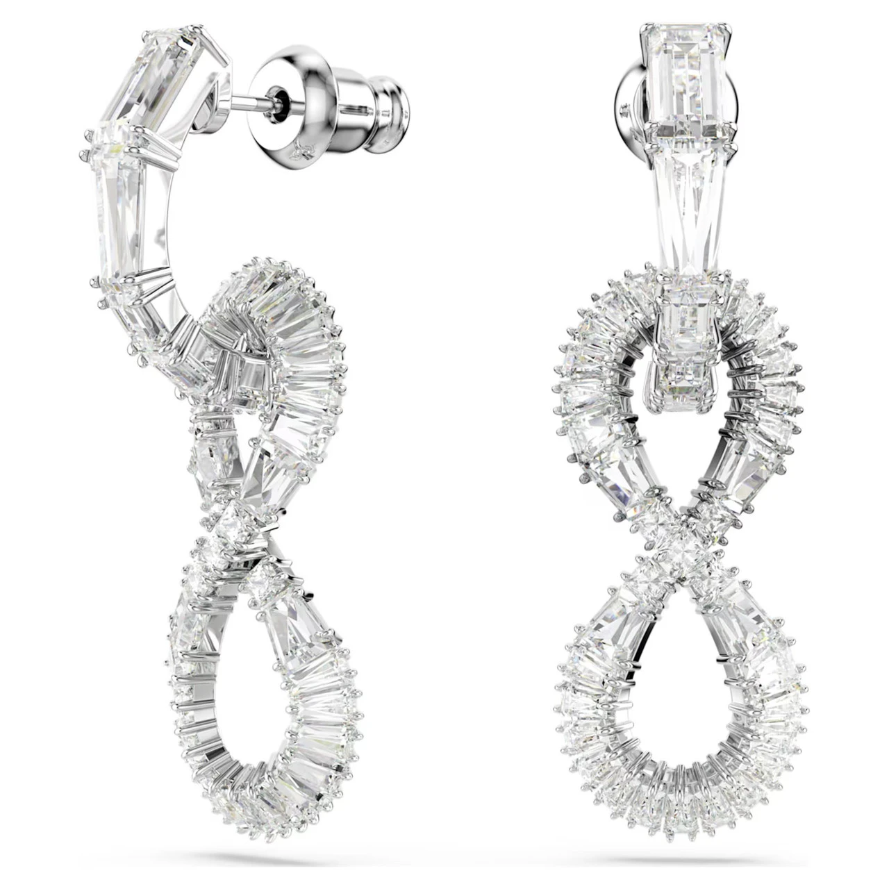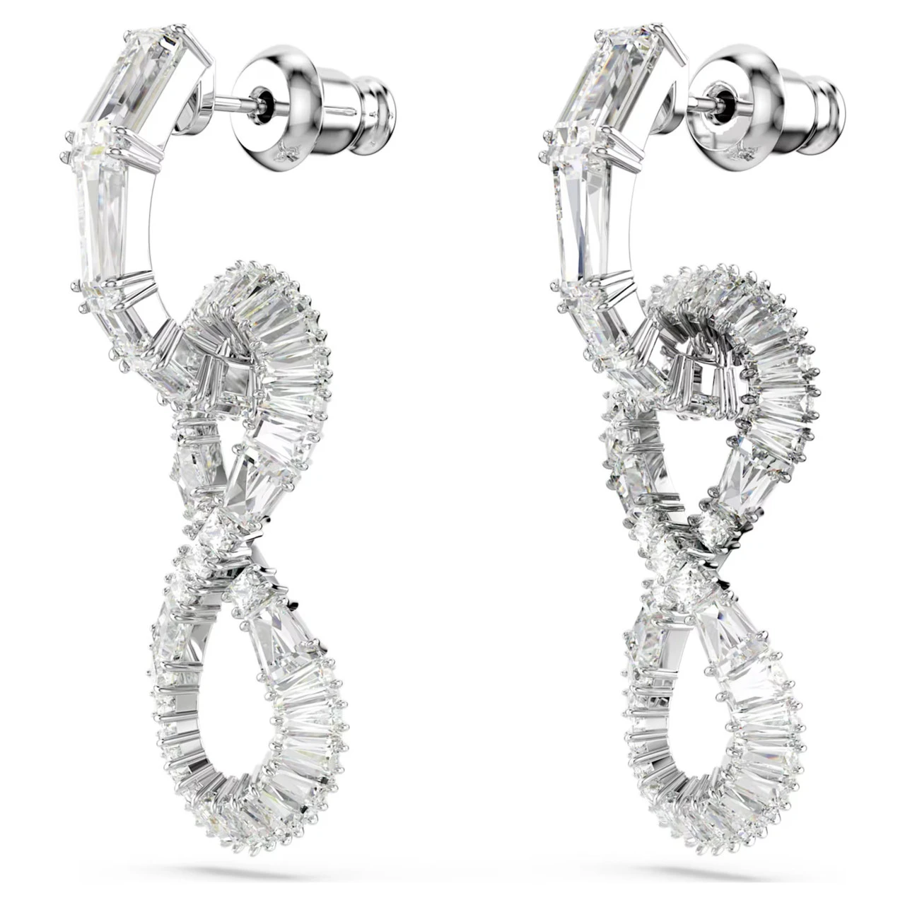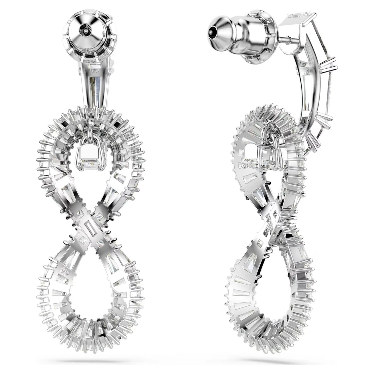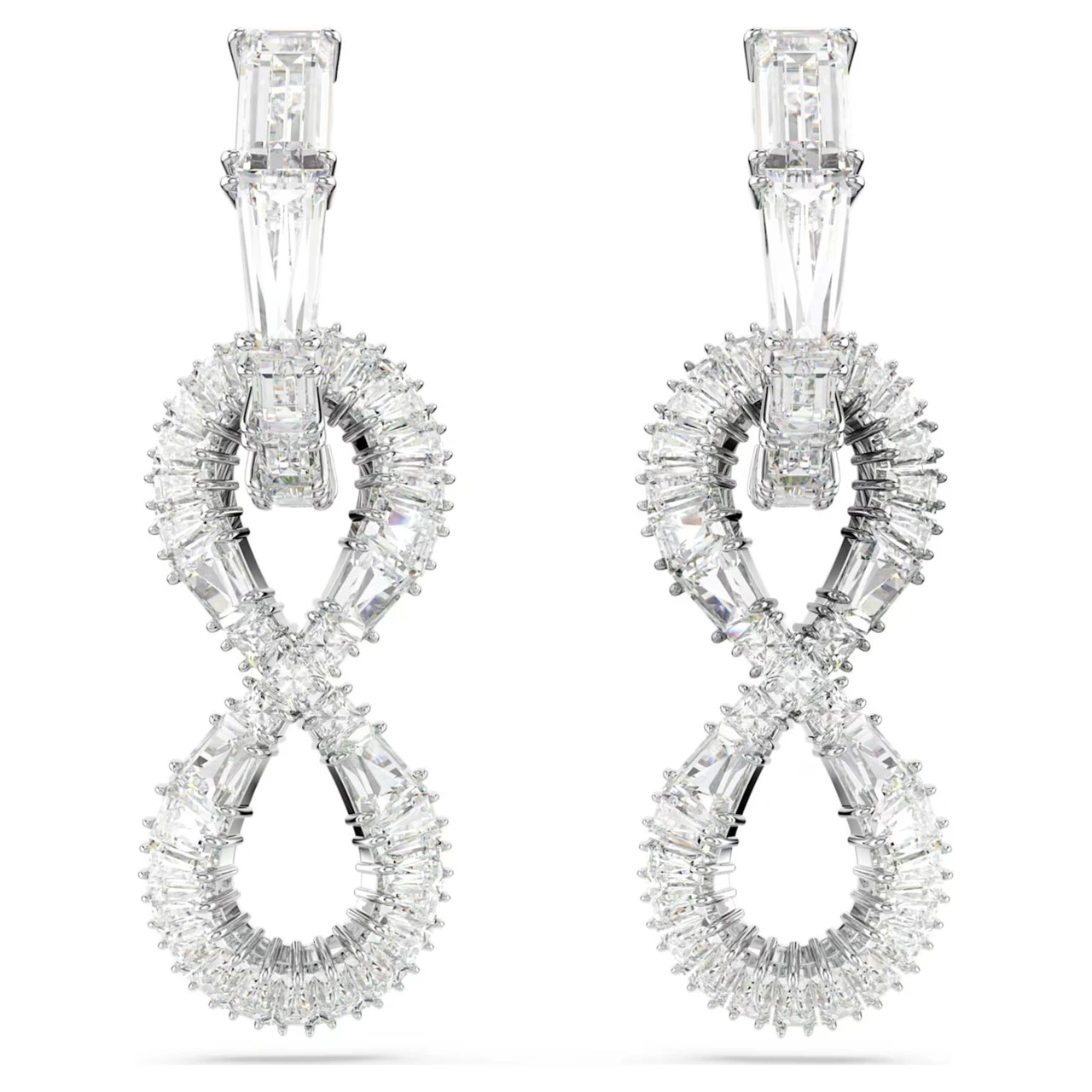 Crafted with timeless style in mind, these exquisite earrings are a wondrous display of Swarovski savoir-faire. Each rhodium-plated piece is fully set with clear Swarovski Zirconia and features a mini hoop attached to an elegant infinity motif. A perfect choice for endless nights of glamour.