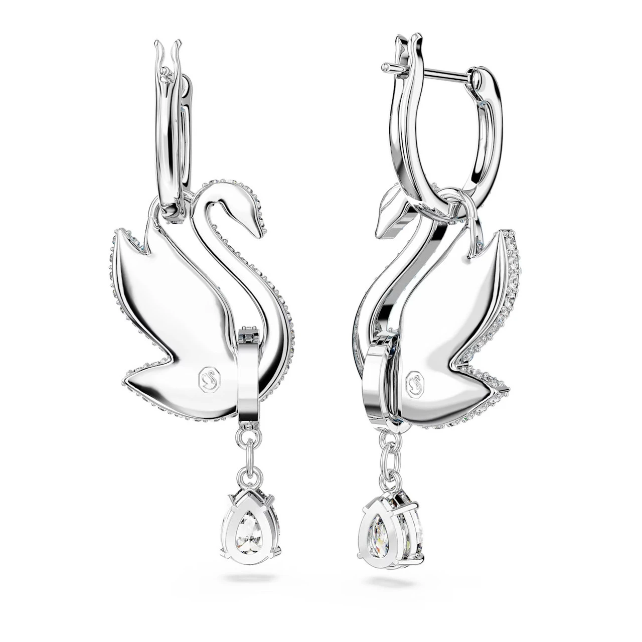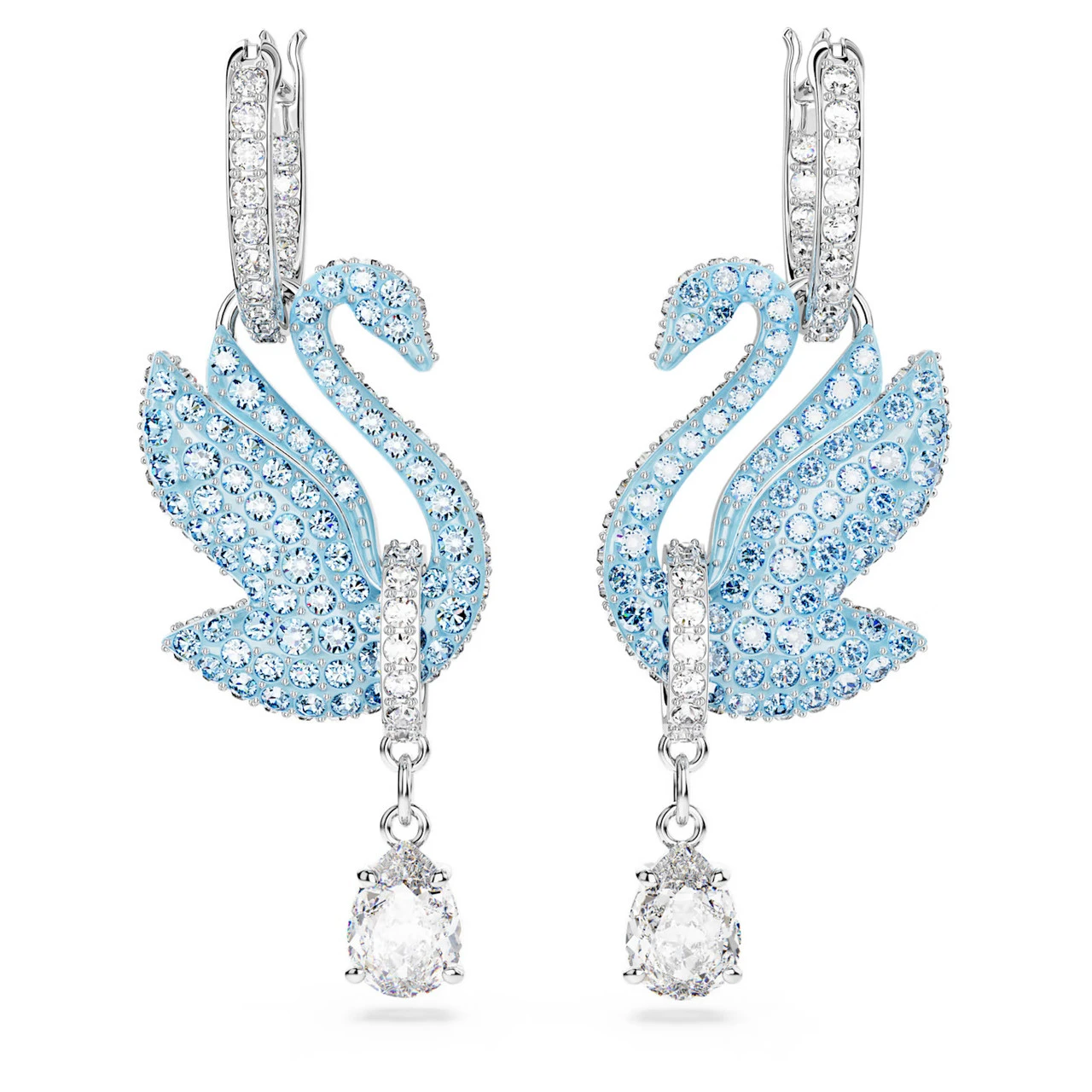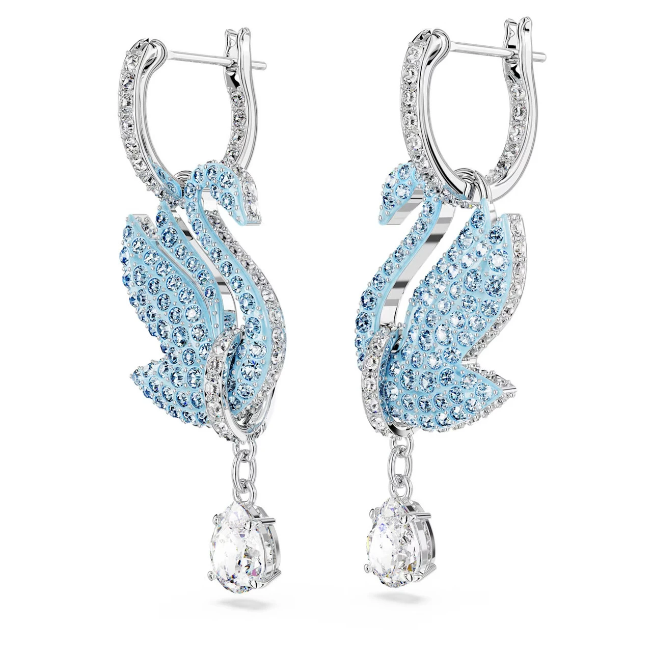 These charming rhodium plated earrings are rich with beauty, grace, and color. Hanging from a single hoop of clear stones, the swan motif has been crafted with a glittering all-over pavé of ice blue crystals. A single pear-shaped stone dangles beneath to catch the light. Reach for these earrings when vibrant statement jewelry is called for.