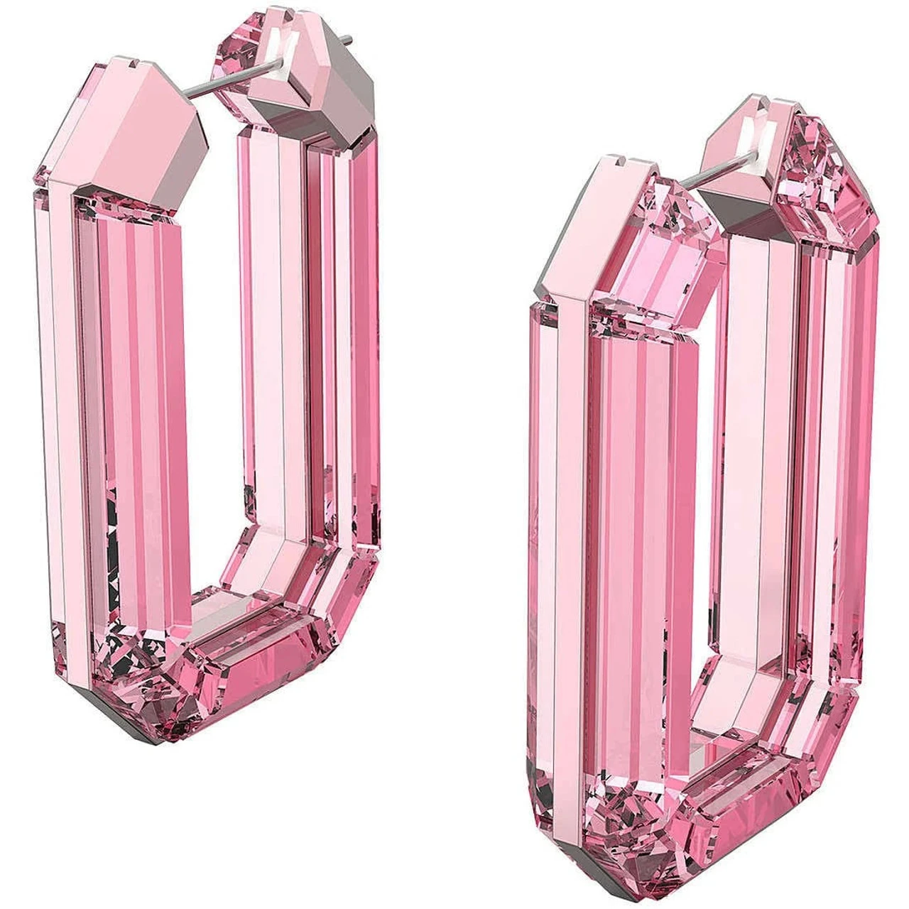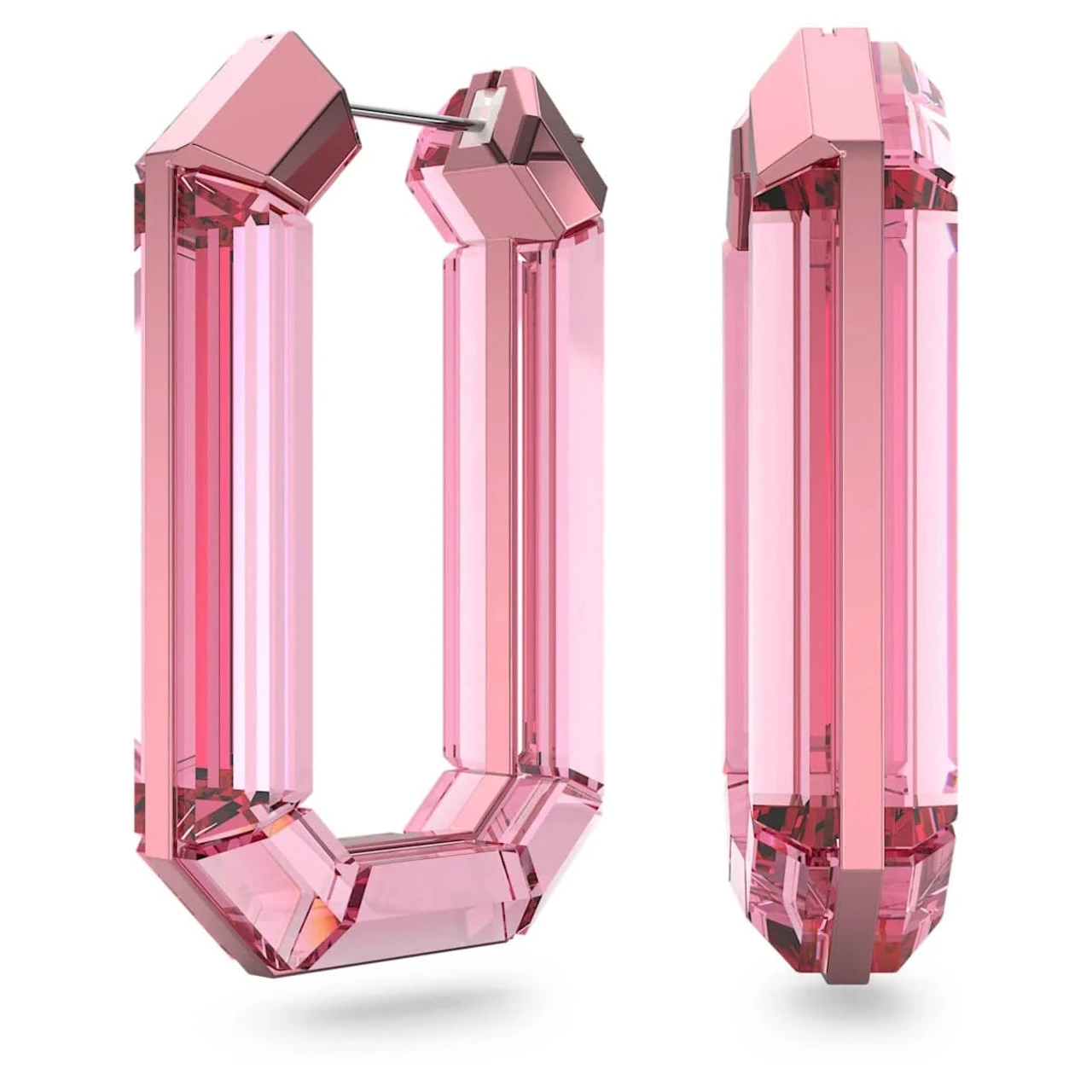 These eye-catching, pink, statement, hoop earrings are a showstopping example of color-saturated, fully cut crystal. A playful feat of engineering, and finished with a subtle post fastening, these earrings can dress up any outfit: from a simple pair of jeans and a crisp, white shirt, or a hoodie and tracksuit pants for a sports luxe edge. These earrings are part of the Lucent family, designed by Creative Director Giovanna Engelbert for Collection II.
