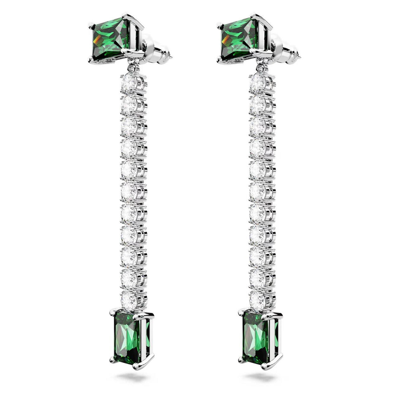 These versatile earrings from the Matrix family can be worn in two ways. The rhodium plated design features green rectangular Swarovski Zirconia studs and earring jackets with an elegant drop of clear round stones and a green rectangular Swarovski Zirconia at the end. The earring jackets have three holes so you can adjust the length, or they can be detached to wear the studs on their own. A stunning piece of jewelry that will add instant glamour to any style.