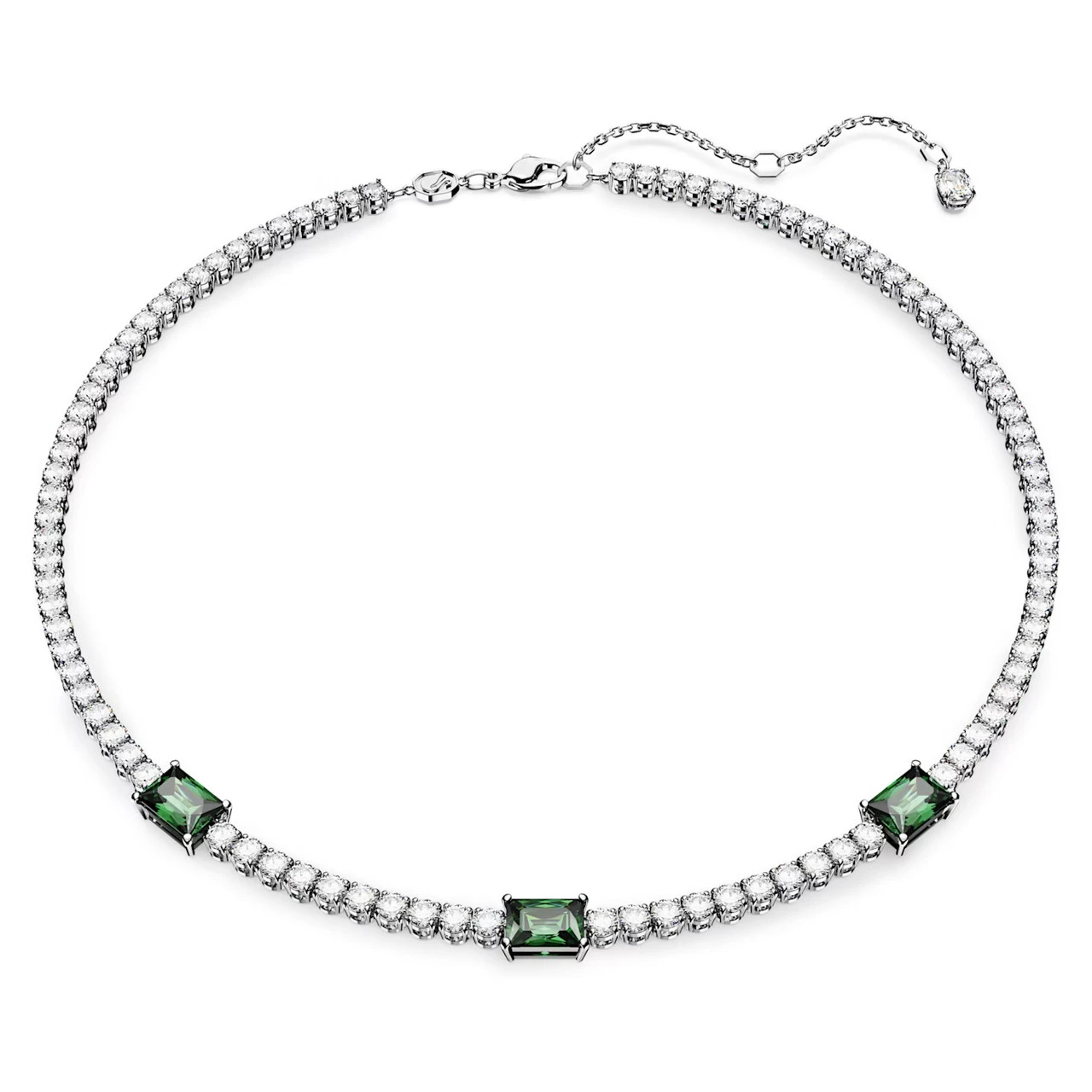 Combining classic elegance with a contemporary twist, this Matrix tennis necklace is both refined and luxurious. An all-around design of clear round stones is interjected by rectangular stones in deep green, illuminated by a rhodium plated setting. This piece will add instant glamour to any celebratory look as well making a memorable gift.