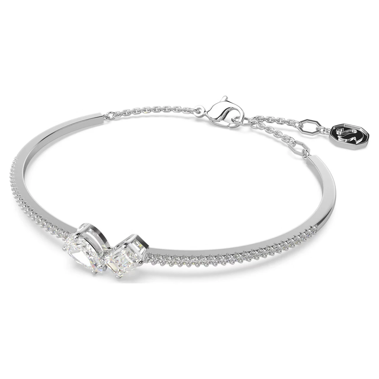 Surround your wrist in the elegant and dazzling style of Mesmera. This rhodium plated bangle features a pavé of crystals on each side, combined with two Swarovski Zirconia at the center in pear and octagon-step cuts. A radiant duo that catches the light from every angle. The bracelet features a hanging elongation and is a refined piece for celebratory occasions.