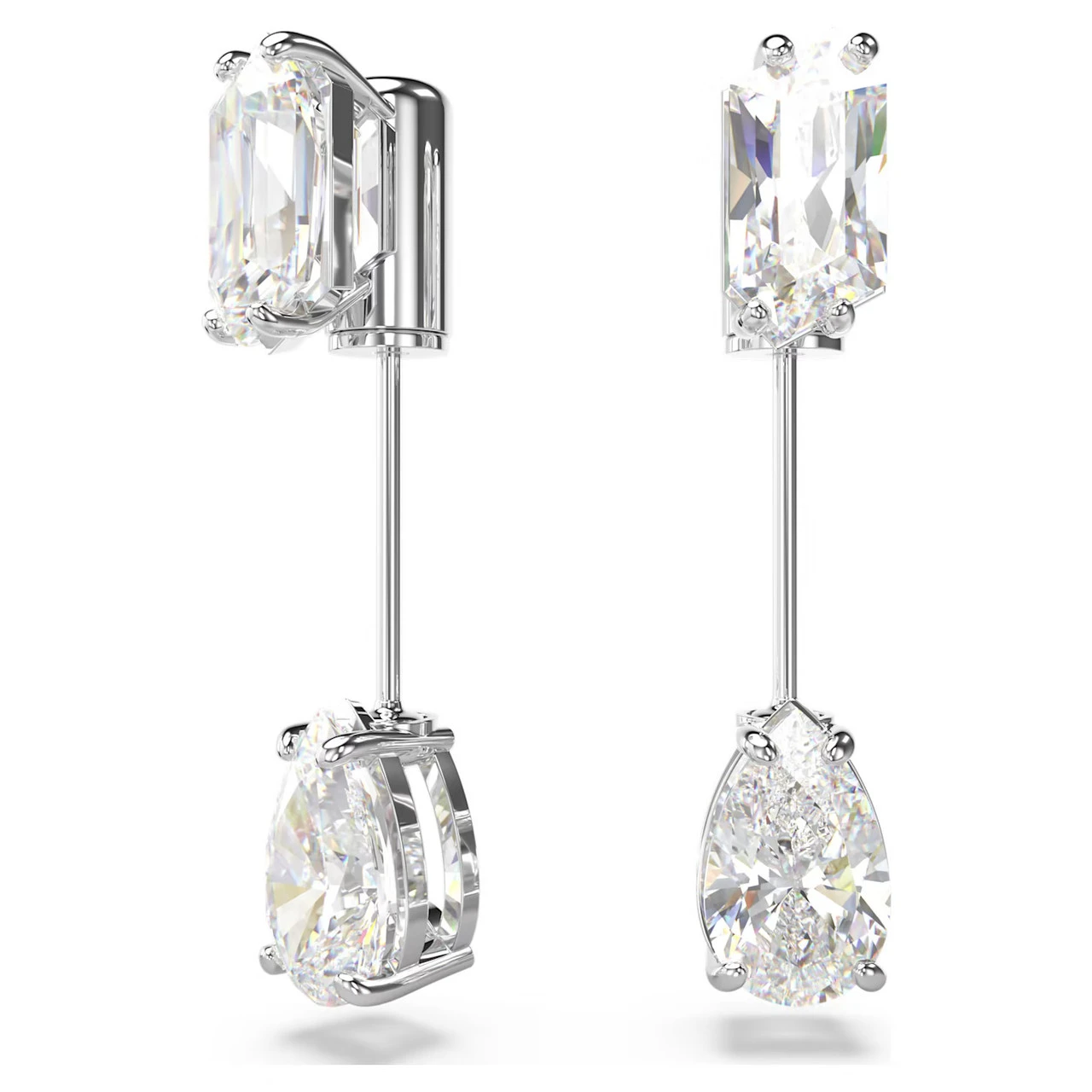 Elegance meets drama in these modern Mesmera earrings. Each piece features a rhodium plated bar with a prong-set Swarovski Zirconia at each end. These two stones are crafted with their own distinctive cuts, giving you a look that is instantly eye-catching. Enhance your own style or present these pierced earrings to a loved one as a wondrous gift.