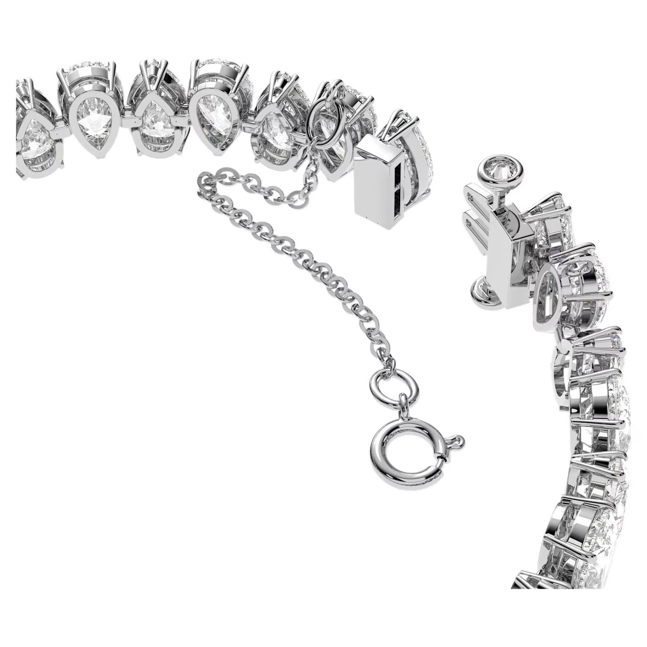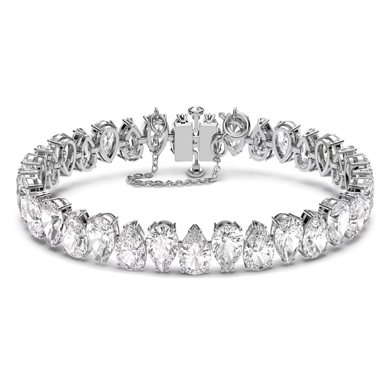 This articulated bracelet is elegantly crafted from pear-cut stones on a rhodium-plated prong setting and finished with a hidden fastening. Designed for fluidity and with a luxe finish, this piece can be worn alone as your new wardrobe essential, or stacked with other bracelets from the Millenia family for a showstopping yet modern impact. This bracelet is part of the Millenia family, designed by Creative Director Giovanna Engelbert for Collection II. How to close and open it: slide the hooks into the corresponding holes at the base of the end stone and push to click into place. Fasten the security chain using the small lever clasp. To open, unfasten the security chain and press the buttons on either side of the stone at the same time to release the hooks.