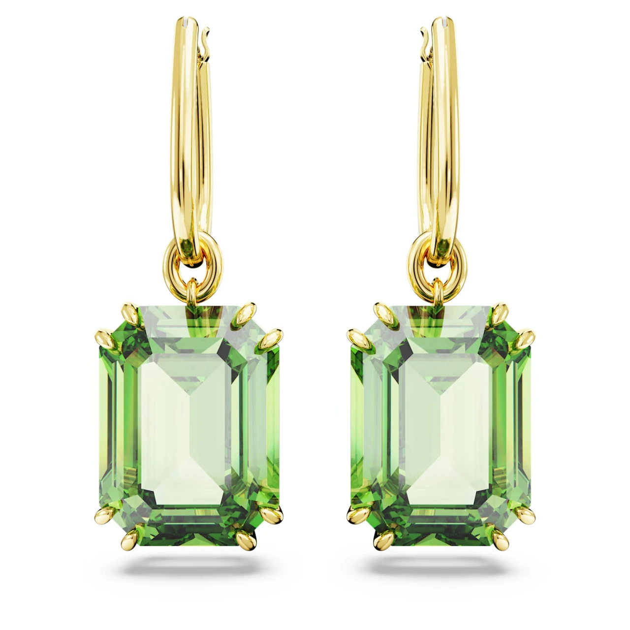 These hypnotic Millenia earrings were made for bold and luminous style. Each gold-tone plated piece features a mini hoop that attaches to an octagonal stone in green. The double-prong setting delivers a refined touch of luxury, while the exquisite faceting ensures light-catching joy from every angle. Wear these pierced earrings with a matching bracelet or necklace to maximize the look.