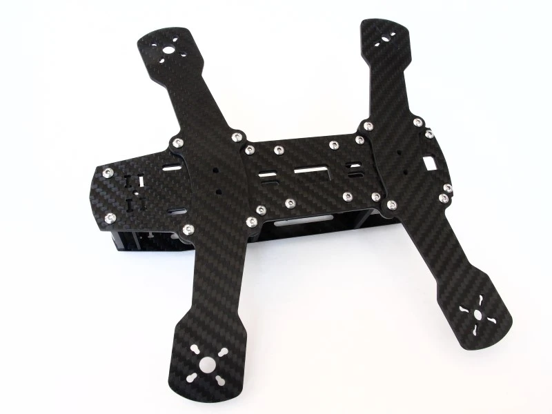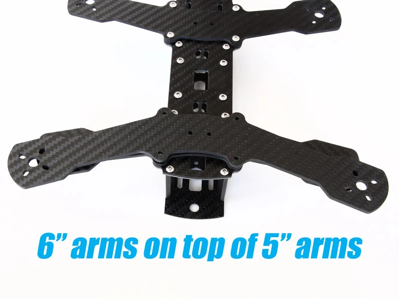 218mm diagonally, motor to motor with standard arms (this is an H frame so distance between motors is 173mm side to side, 132mm front to back. 255mm diagonally with Extended arms (201mm side to side, 160mm front to back)