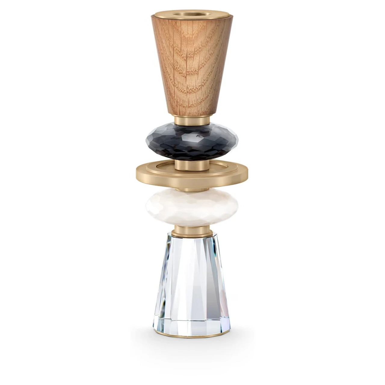 Inspired by the warm, earthy hues of African landscapes, this candle holder radiates elegance with its timeless combination of crystal, wood, and metal. With a total of 359 facets, the crystal elements shine in clear, white, and dark gray tones, while the metal features a brushed champagne-gold tone finish and the oak is FSC-certified. A stylish gift idea for a wedding, anniversary or any other special occasion. Decoration object. Not a toy. Not suitable for children under 15.
