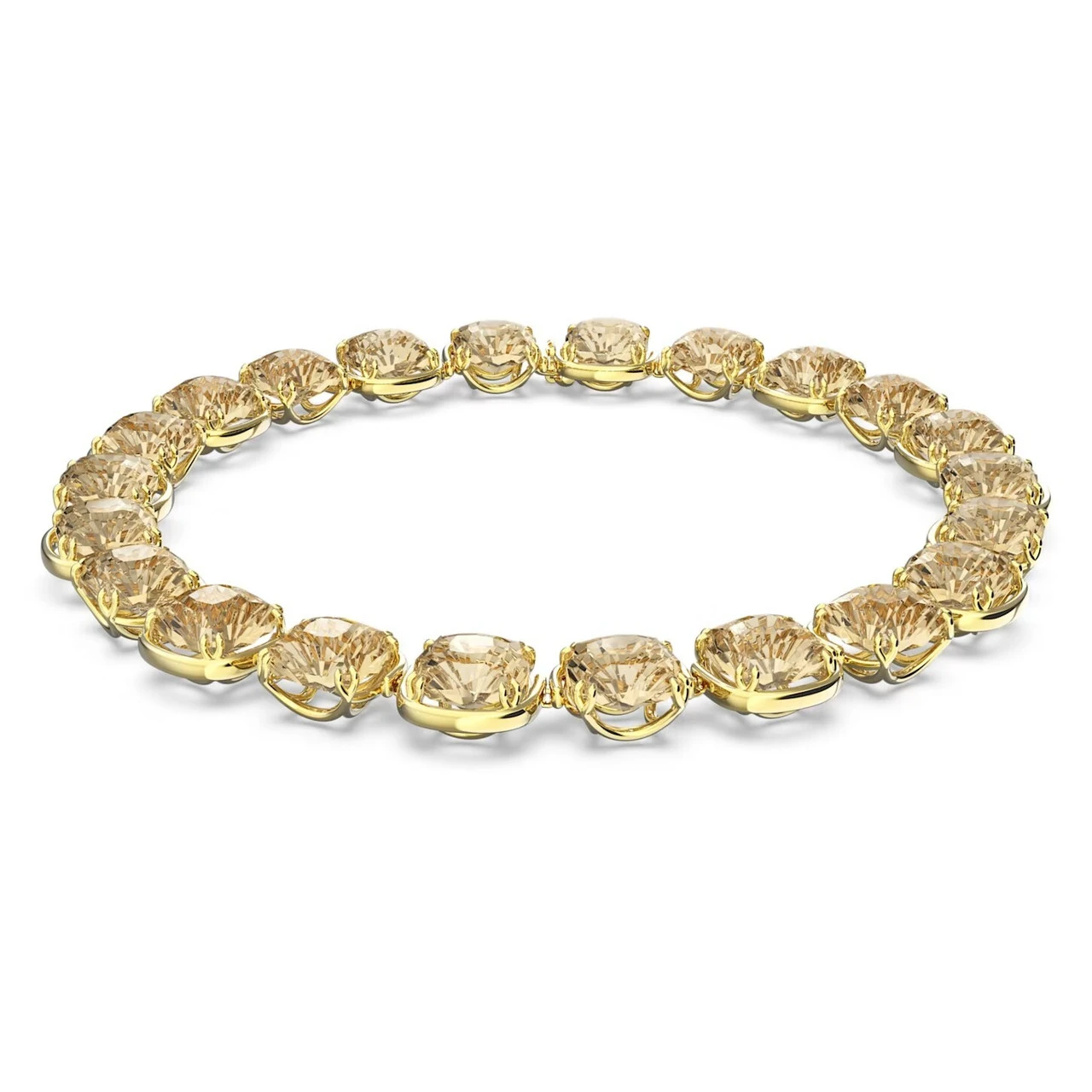 Designed to give the illusion of floating stones, this all-around choker will make an iconic addition to your jewelry collection. Belonging to the Harmonia family, it shines bright with cushion-cut crystals in an ultramodern gold-tone plated setting. Wear yours solo or stacked with other mesmerizing jewels to bring a sense of mystery to any look.How to close and open it: place the rounded baton into the widest point of the opposite hole and slide it down to the lowest point. Once in place, lower the D-ring security catch on top to secure the fastening. To open, lift up the D-ring security catch and slide the baton towards the widest point to release.