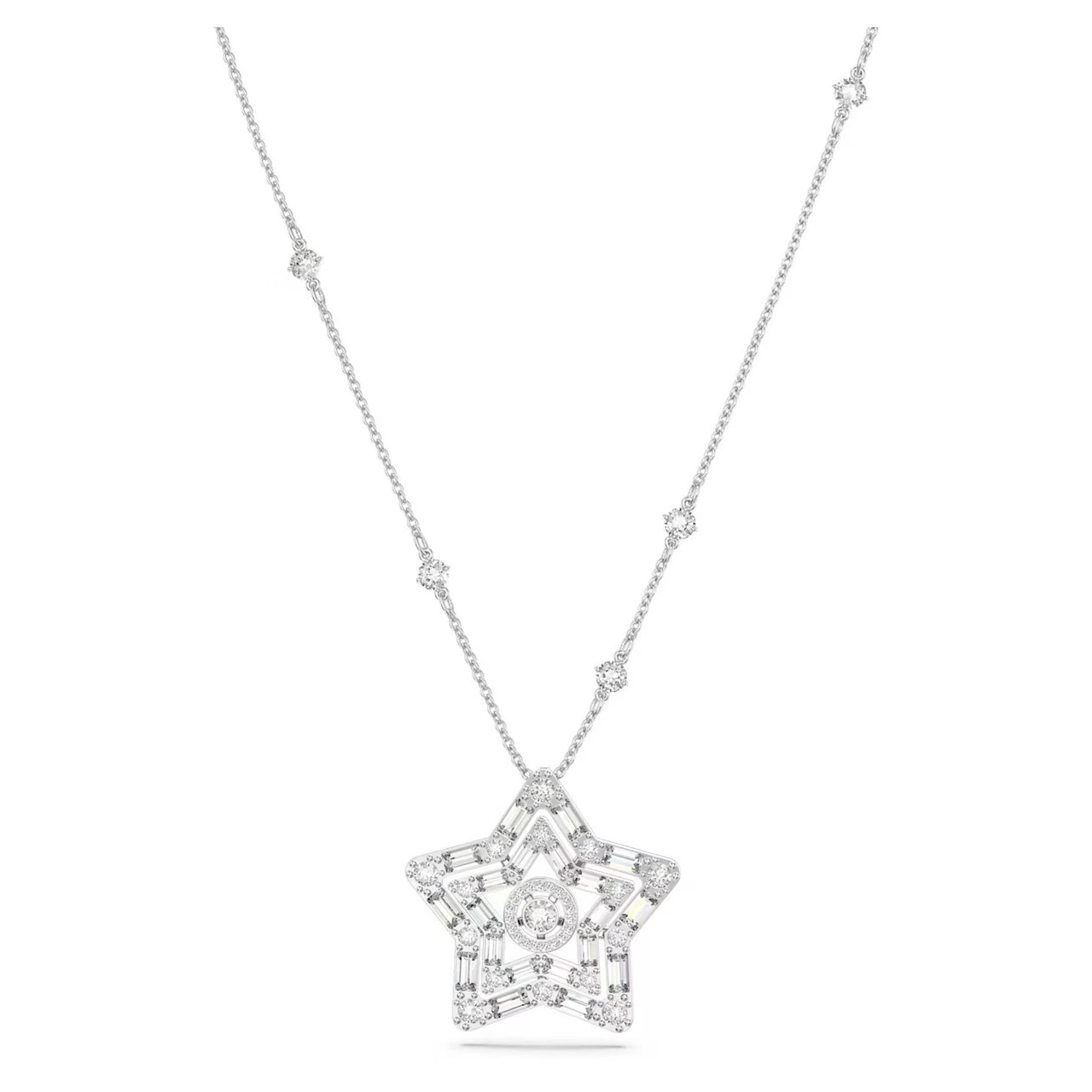 Feel the magic of the night sky with this Stella pendant. The star motif glitters with baguette-cut crystals around a centerstone complemented by sparks of crystal light along the chain. This rhodium plated design features a sliding ball closure for an adjustable fit. Style yours alone or with other dreamy pieces from the Stella family.