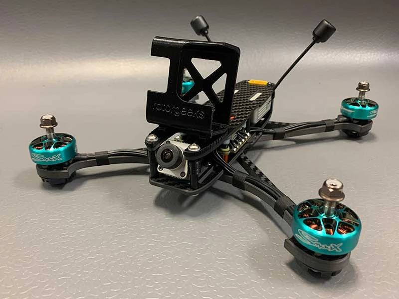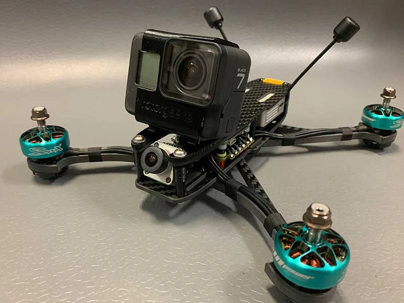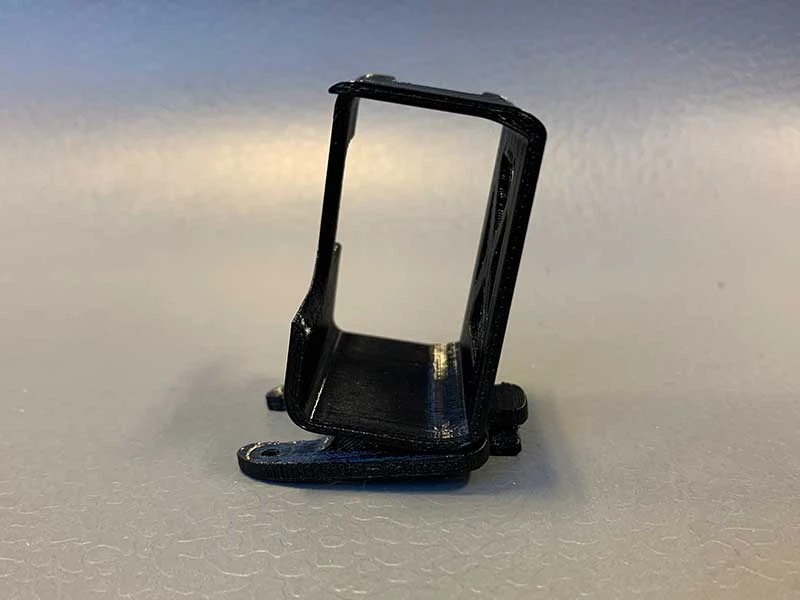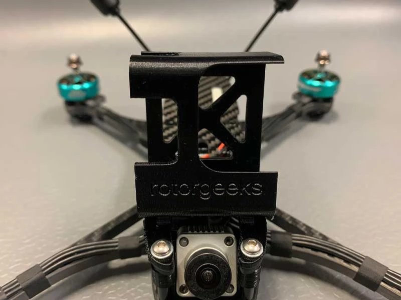A dedicated 3D printed Go Pro Hero7 Black mount with a 15 degree angle for the Vorsin frame. The mount is secured by two front screws and a twist lock on the back that specifically fits the Vorsin, making for easy removal.
