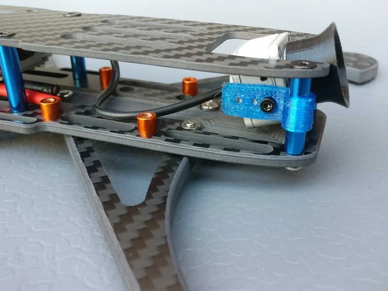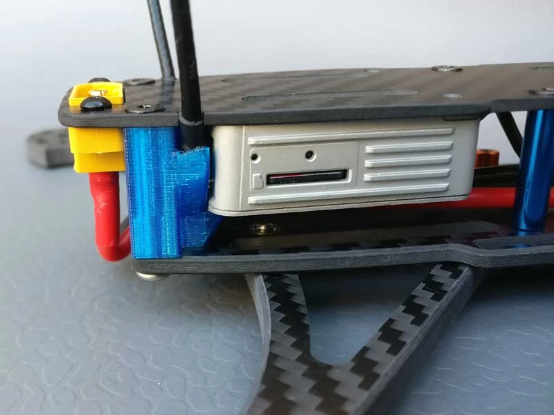 - Remove the screws from the side of the Air Unit Camera and use the lower screw on each side to attach to the TPU camera mount. Slide the camera onto the two front spacers.