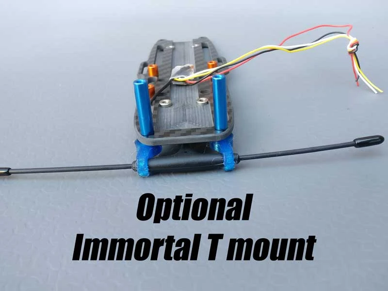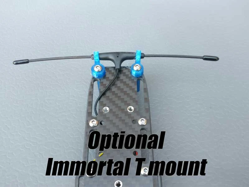 The mount for an Immortal T is optional for Crossfire users. It can be placed on the front or back and the Crossfire Nano fits nicely into the channel running through the bottom plate.