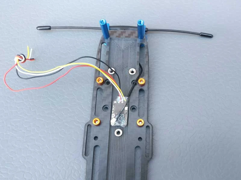 - If using a control receiver (FrSKY, Crossfire) set the receiver in place – usually with some double sided tape in the channel of the bottom plate under the stack. You’ll want the wires soldered on if required